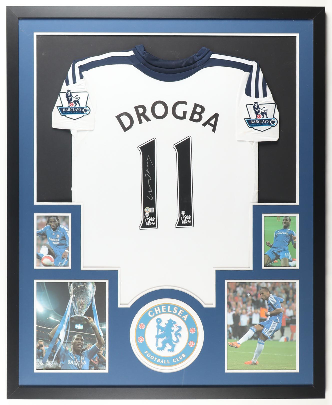 Custom frame measures 34" x 42" in size and features a custom jersey that has been hand-signed by Didier Drogba (Chelsea FC). Please refer to photos regarding the condition of the item.