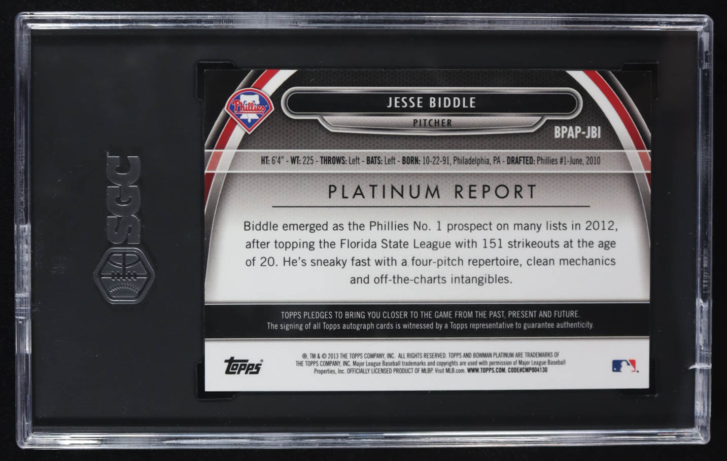 Jesse Biddle 2013 Bowman Platinum Prospect Autographs #JBI (SGC 9 | Autograph Graded SGC 10)