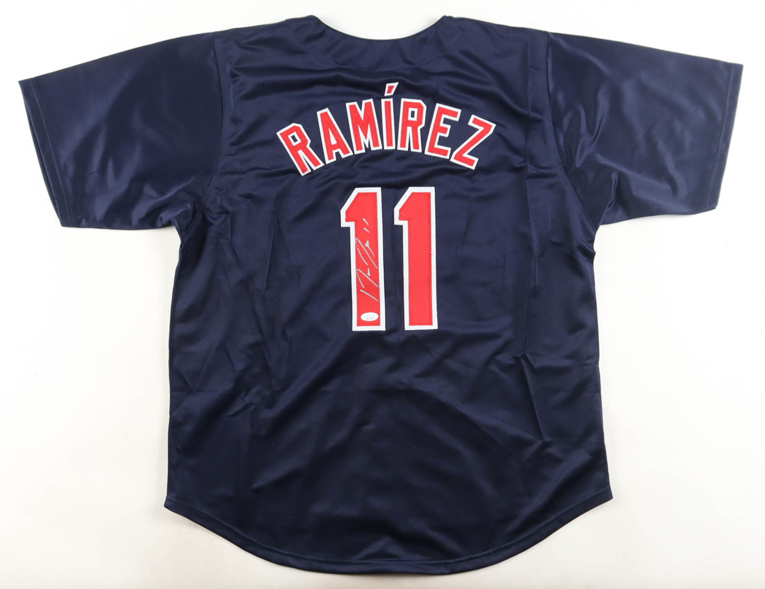 Custom jersey, everything sewn on, and is size XL.. Hand-signed by Jose Ramirez.