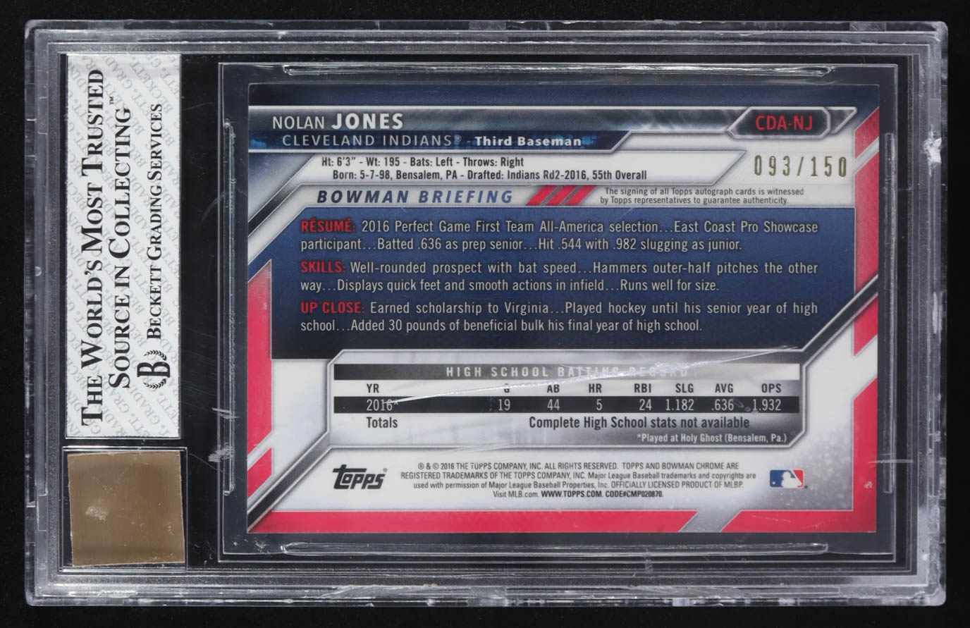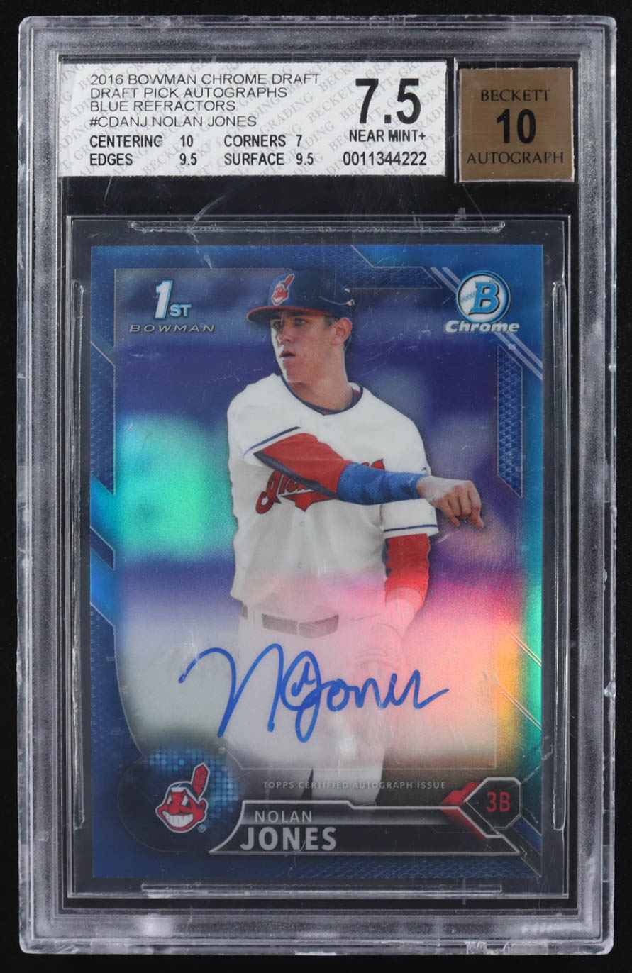 Nolan Jones 2016 Bowman Chrome Draft Draft Pick Autographs Blue Refractors #CDANJ (BGS 7.5 | Autograph Graded BGS 10)