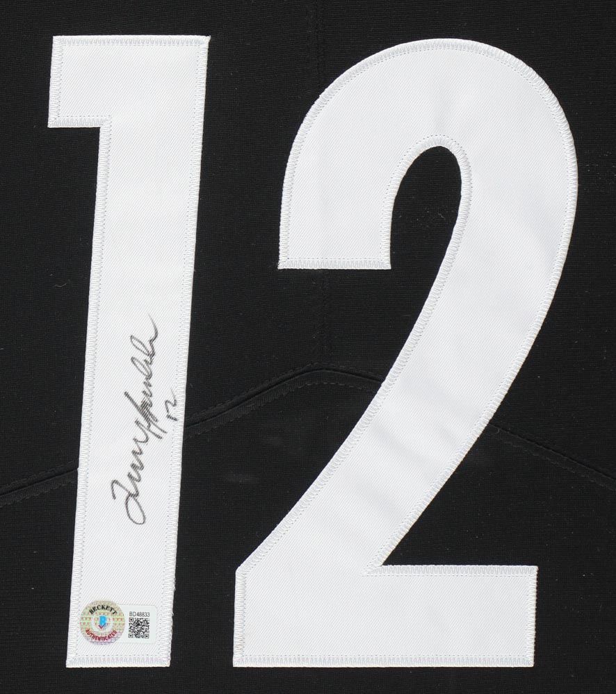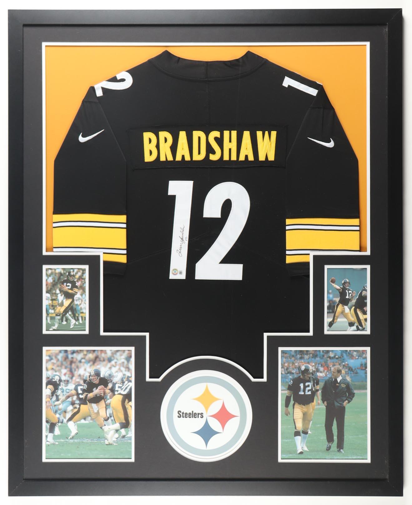 Custom frame measures 34" x 42" in size and features a custom Steelers authentic Nike jersey that has been hand-signed by Terry Bradshaw (Pittsburgh Steelers, HOF). Please refer to photos regarding the condition of the item.
