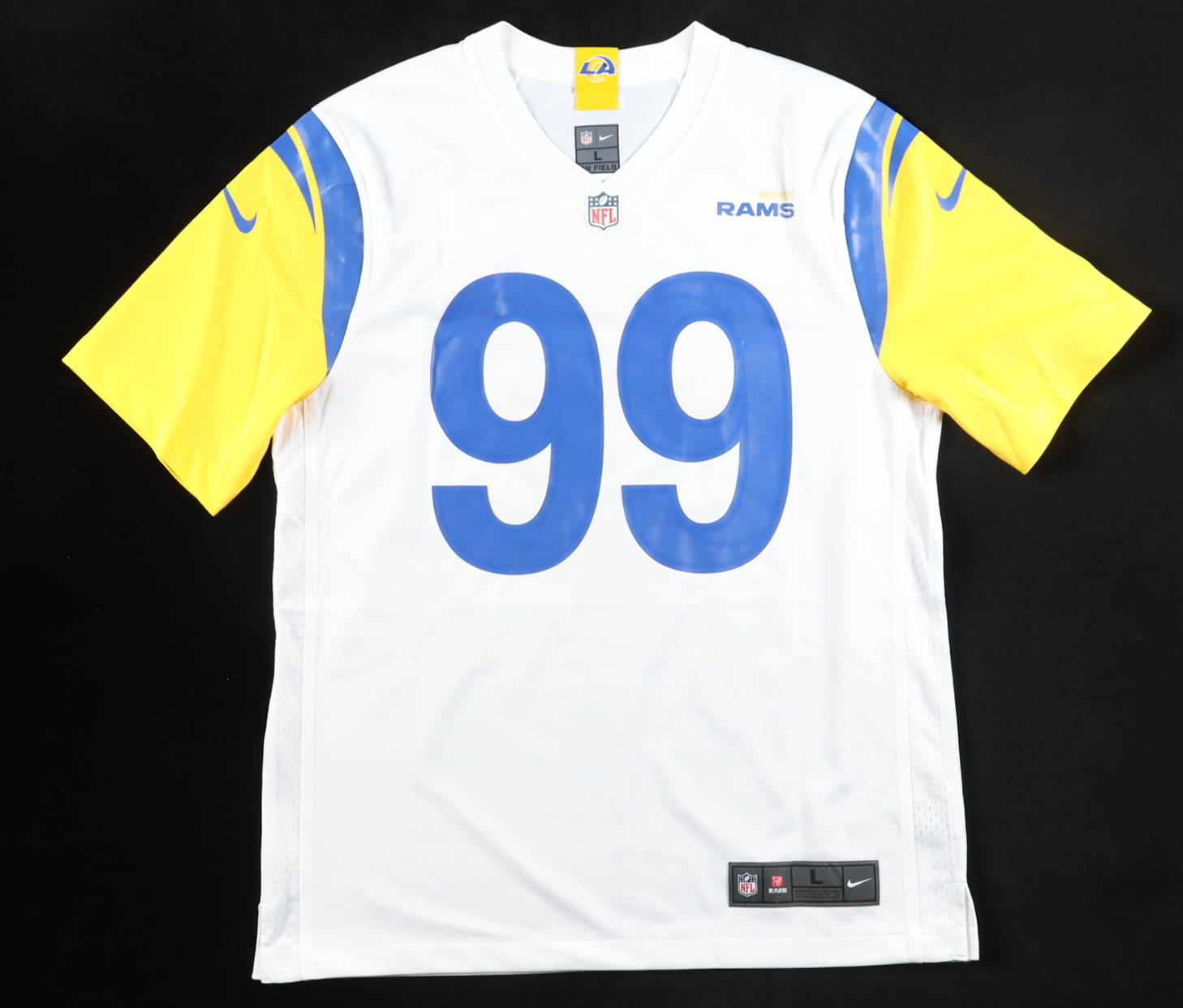 Nike jersey with everything sewn on, size L. Has been hand-signed by Aaron Donald (Los Angeles Rams).