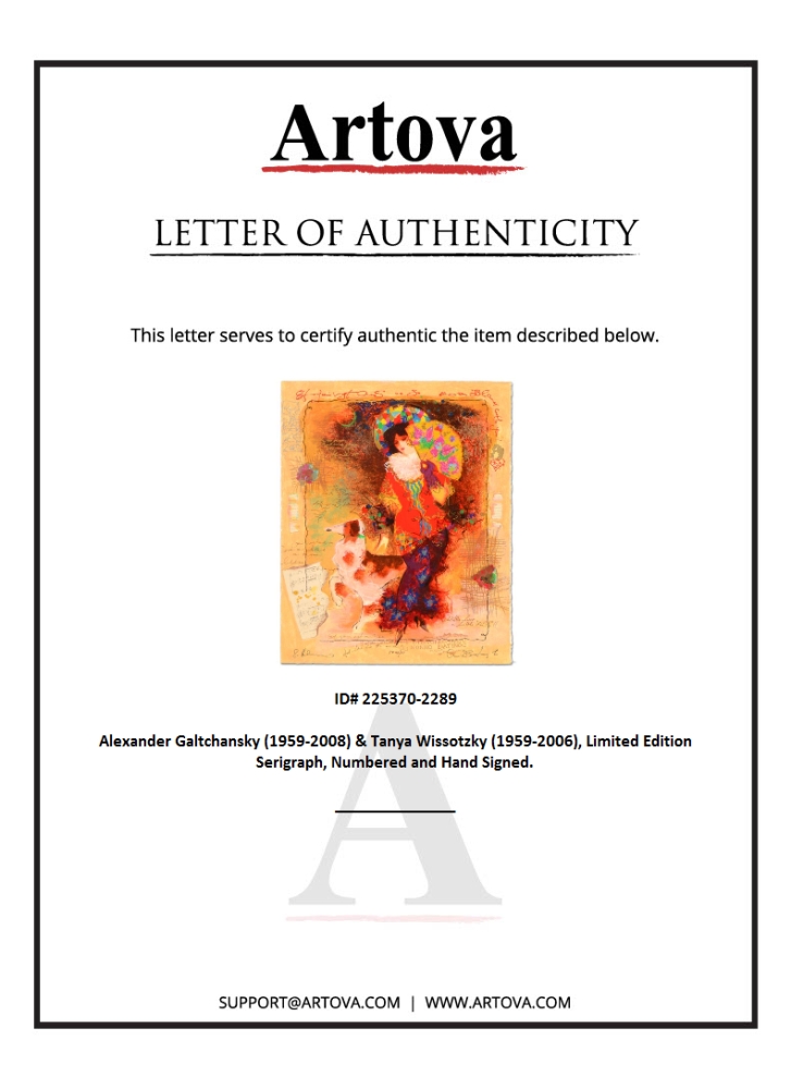 This is a limited edition serigraph on deckle edge paper, numbered and hand signed by Alexander Galtchansky (1959-2008) and Tanya Wissotzky (1959-2006). Includes Certificate of Authenticity. Measures approx. 13" x 16.5" (image).