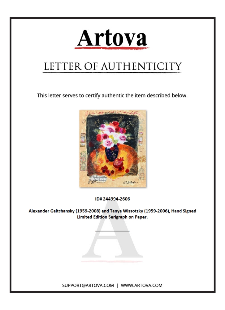 "Red Cherries" is a limited edition serigraph on deckle edged paper by Alexander Galtchansky (1959-2008) and Tanya Wissotzky (1959-2006). It is numbered and hand signed and includes a letter of authenticity. Measures approximately 10" x 12" (image).