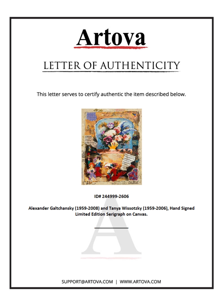 This is a hand embellished, limited edition serigraph on canvas by Alexander Galtchansky (1959-2008) and Tanya Wissotzky (1959-2006). It is numbered and hand signed and includes a letter of authenticity. Measures approximately 18" x 13.5" (image).