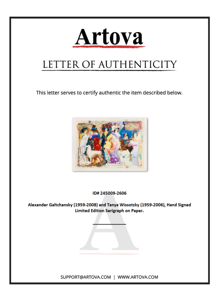 This is a limited edition serigraph on deckle edged paper by Alexander Galtchansky (1959-2008) and Tanya Wissotzky (1959-2006). It is numbered and hand signed and includes a letter of authenticity. Measures approximately 29" x 43.5" (image). Please note: there are some stains in the border area.