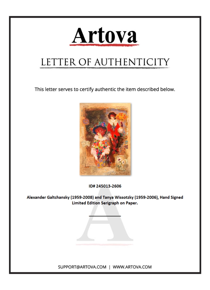 This is a limited edition serigraph on deckle edged paper by Alexander Galtchansky (1959-2008) and Tanya Wissotzky (1959-2006). It is numbered and hand signed and includes a letter of authenticity. Measures approximately 28.5" x 39" (image).