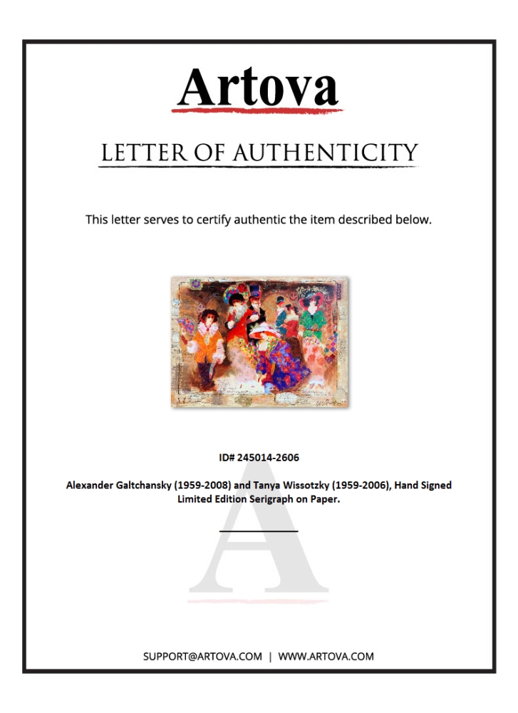 "Love and Romance" is a limited edition serigraph on deckle edged paper by Alexander Galtchansky (1959-2008) and Tanya Wissotzky (1959-2006). It is numbered and hand signed and includes a letter of authenticity. Measures approximately 26" x 37.5" (image).