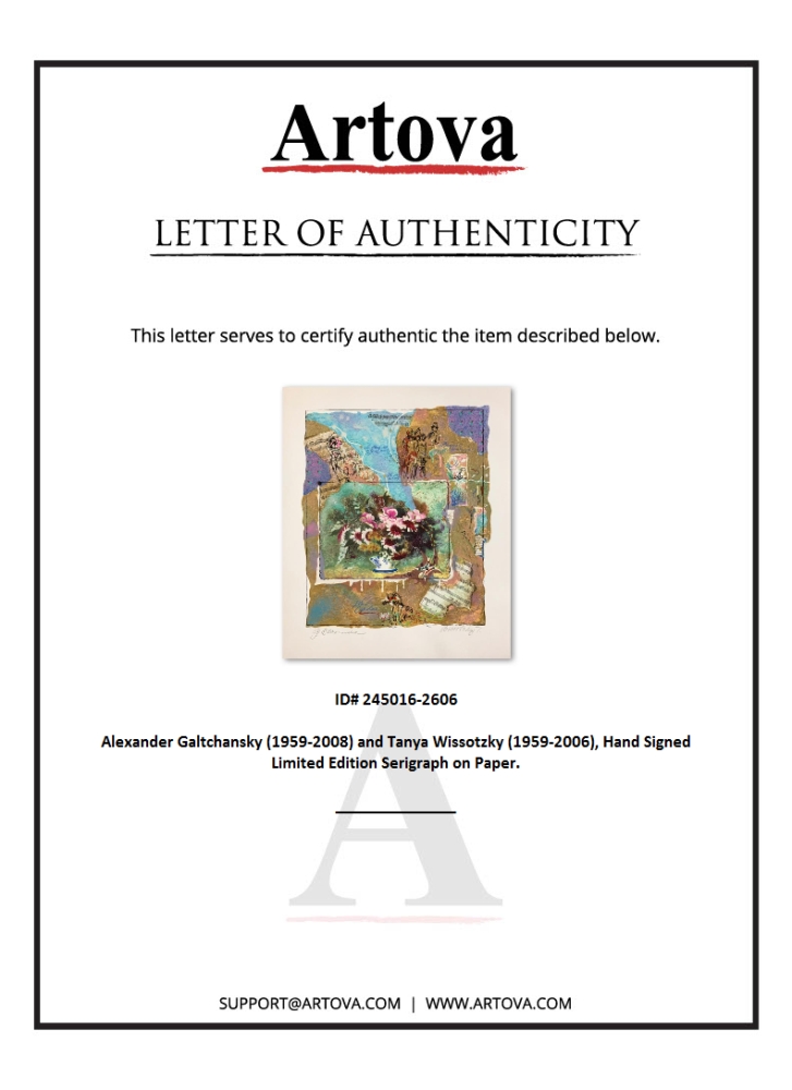 This is a limited edition serigraph on deckle edged paper by Alexander Galtchansky (1959-2008) and Tanya Wissotzky (1959-2006). It is numbered and hand signed and includes a letter of authenticity. Measures approximately 19" x 14.5" (image).