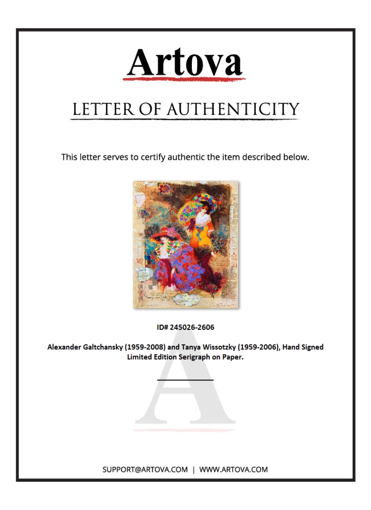 "Waiting for the Party" is a limited edition serigraph on deckle edged paper by Alexander Galtchansky (1959-2008) and Tanya Wissotzky (1959-2006). It is numbered and hand signed and includes a letter of authenticity. Measures approximately 24.5" x 19" (image).
