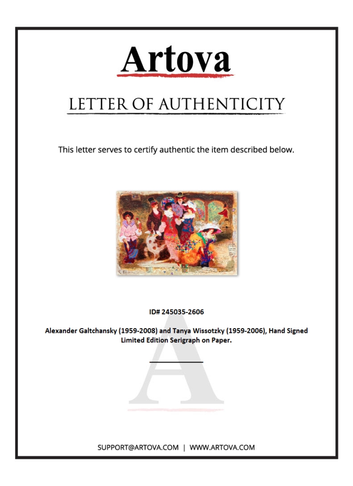 "Nocturne II" is a limited edition serigraph on deckle edged paper by Alexander Galtchansky (1959-2008) and Tanya Wissotzky (1959-2006). It is numbered and hand signed and includes a letter of authenticity. Measures approximately 27" x 37.5" (image).