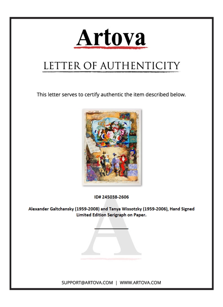 This is a limited edition serigraph on deckle edged paper by Alexander Galtchansky (1959-2008) and Tanya Wissotzky (1959-2006). It is numbered and hand signed and includes a letter of authenticity. Measures approximately 36" x 26" (image).