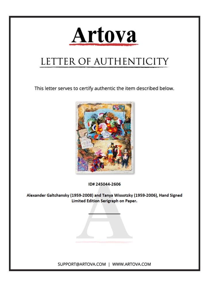 This is a limited edition serigraph on deckle edged paper by Alexander Galtchansky (1959-2008) and Tanya Wissotzky (1959-2006). It is numbered and hand signed and includes a letter of authenticity. Measures approximately 27" x 36" (image). Please note: there are some stains in the border area.