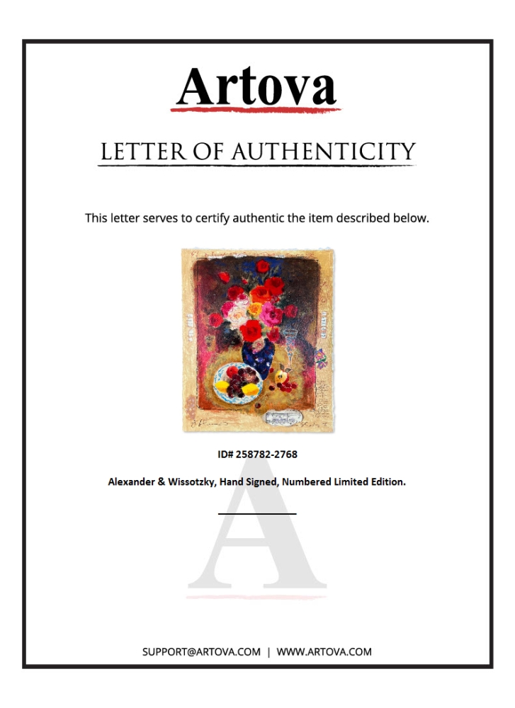This is a limited edition on paper by Alexander & Wissotzky. The piece comes hand signed by the artist, numbered, and with a letter of authenticity. Measures approximately 8" x 7".