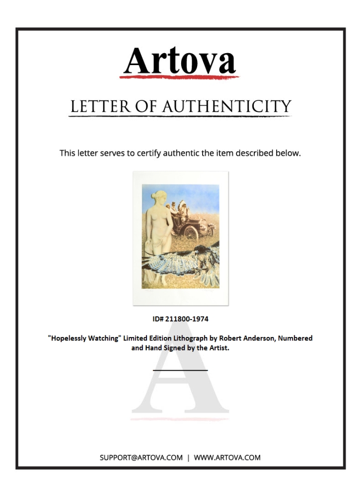 "Hopelessly Watching" is a limited edition lithograph on paper by Robert Anderson, numbered and hand signed by the artist. Measures approximately 20" x 28" (with border), 16" x 21" (image).