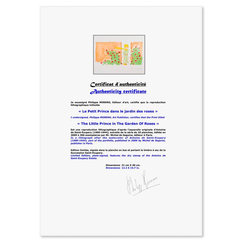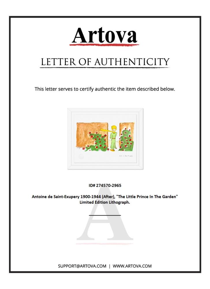 "The Little Prince In The Garden" is a limited edition lithograph on paper by Antoine de Saint-Exupery 1900-1944 (After), bearing the plate signature of the artist.This piece comes from an edition of 300 authorized by the Exupery Estate, but the pieces in this edition are not individually numbered. This piece comes custom framed. Includes Certificate of Authenticity. Measures approx. 16" x 20" (frame) 12" x 16" (image). This item requires special handling and may have a longer than usual turnaround.