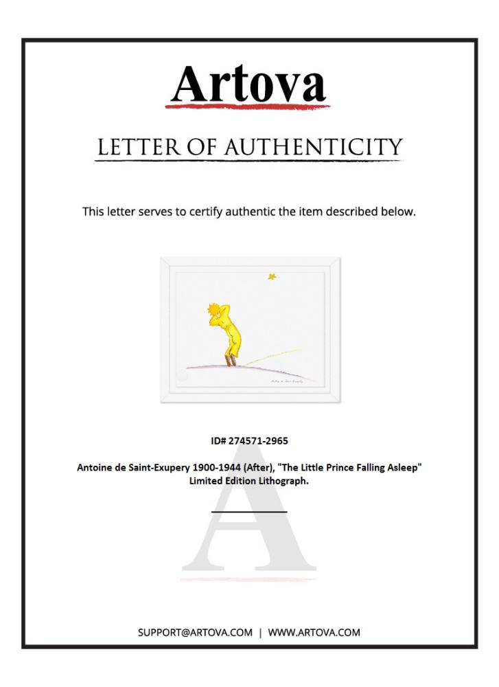 "The Little Prince Falling Asleep" is a limited edition lithograph on paper by Antoine de Saint-Exupery 1900-1944 (After), bearing the plate signature of the artist.This piece comes from an edition of 300 authorized by the Exupery Estate, but the pieces in this edition are not individually numbered. This piece comes custom framed. Includes Certificate of Authenticity. Measures approx. 16" x 20" (frame) 12" x 16" (image). This item requires special handling and may have a longer than usual turnaround.