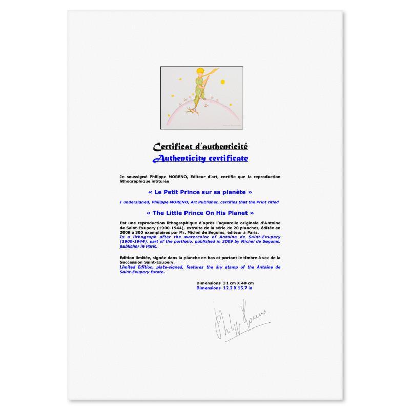 "The Little Prince On His Planet" is a limited edition lithograph on paper by Antoine de Saint-Exupery 1900-1944 (After), bearing the plate signature of the artist.This piece comes from an edition of 300 authorized by the Exupery Estate, but the pieces in this edition are not individually numbered. This piece comes custom framed. Includes Certificate of Authenticity. Measures approx. 16" x 20" (frame) 12" x 16" (image). This item requires special handling and may have a longer than usual turnaround.