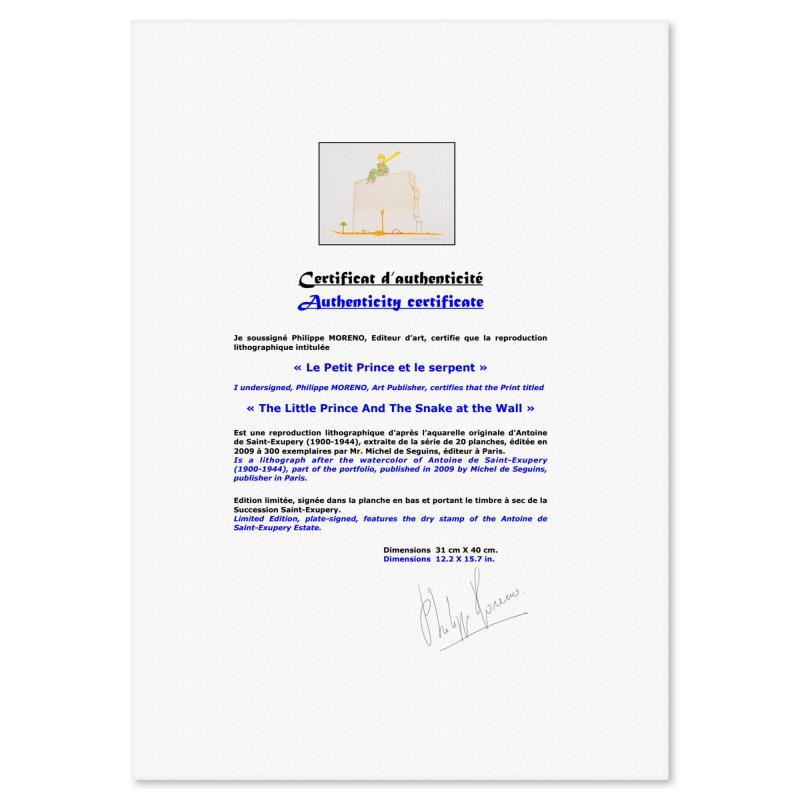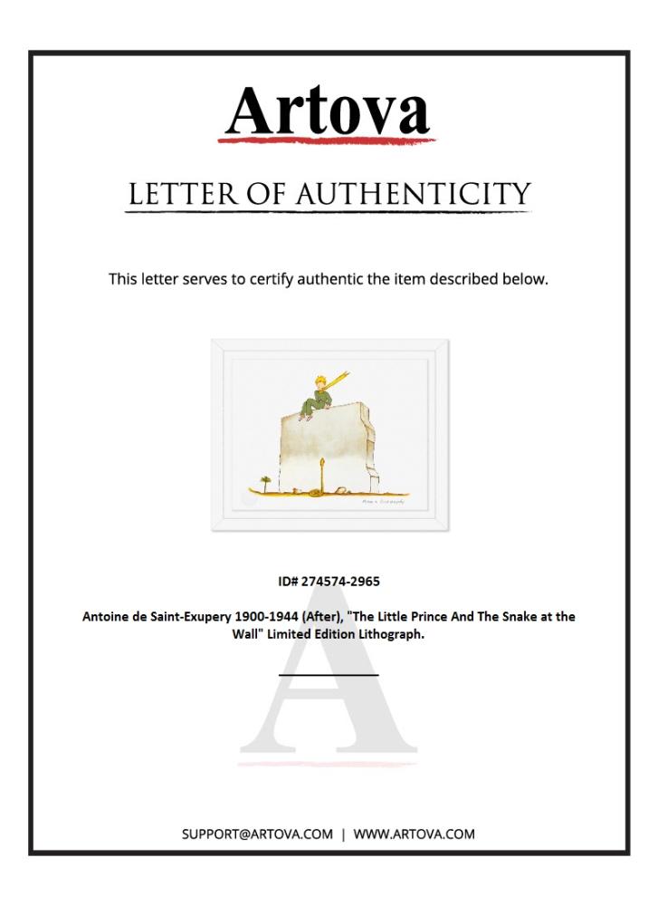 "The Little Prince And The Snake at the Wall" is a limited edition lithograph on paper by Antoine de Saint-Exupery 1900-1944 (After), bearing the plate signature of the artist.This piece comes from an edition of 300 authorized by the Exupery Estate, but the pieces in this edition are not individually numbered. This piece comes custom framed. Includes Certificate of Authenticity. Measures approx. 16" x 20" (frame) 12" x 16" (image). This item requires special handling and may have a longer than usual turnaround.