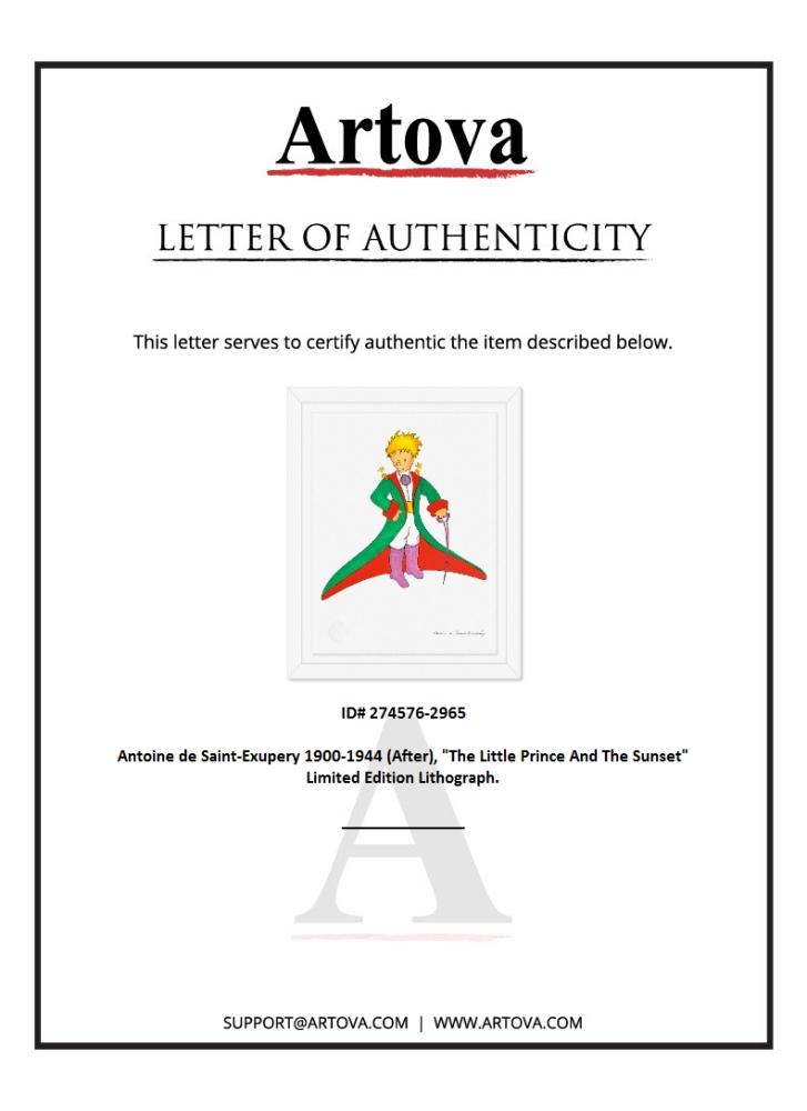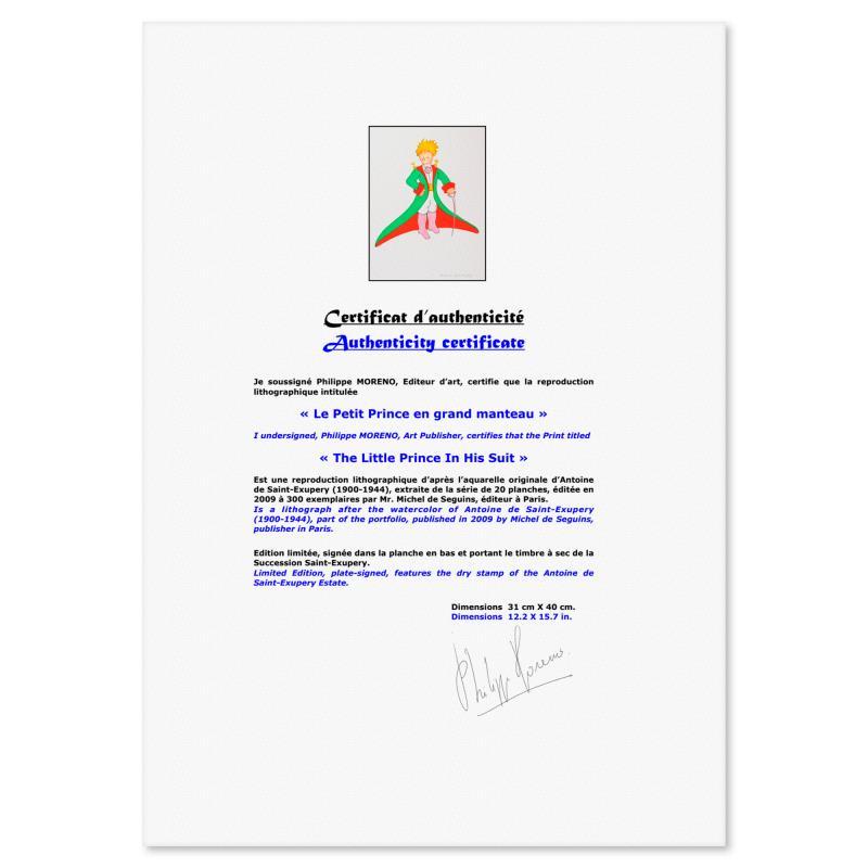 "The Little Prince In His Suit" is a limited edition lithograph on paper by Antoine de Saint-Exupery 1900-1944 (After), bearing the plate signature of the artist.This piece comes from an edition of 300 authorized by the Exupery Estate, but the pieces in this edition are not individually numbered. This piece comes custom framed. Includes Certificate of Authenticity. Measures approx. 20" x 16" (frame) 16" x 12" (image). This item requires special handling and may have a longer than usual turnaround.