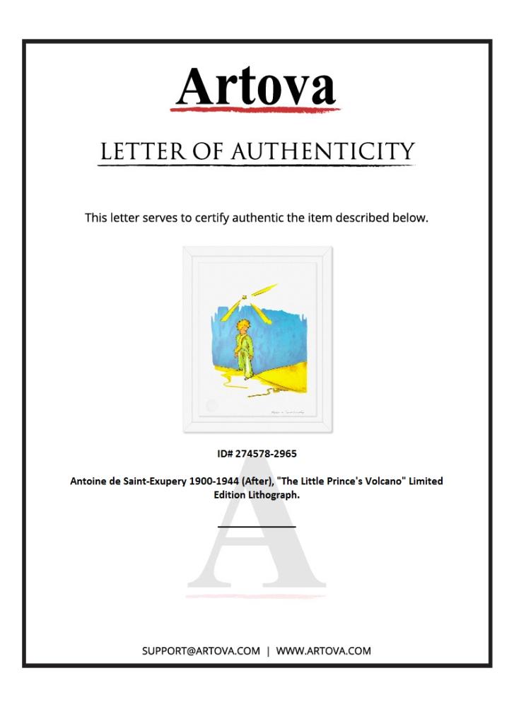 "The Little Prince And The Snake" is a limited edition lithograph on paper by Antoine de Saint-Exupery 1900-1944 (After), bearing the plate signature of the artist.This piece comes from an edition of 300 authorized by the Exupery Estate, but the pieces in this edition are not individually numbered. This piece comes custom framed. Includes Certificate of Authenticity. Measures approx. 20" x 16" (frame) 16" x 12" (image). This item requires special handling and may have a longer than usual turnaround.