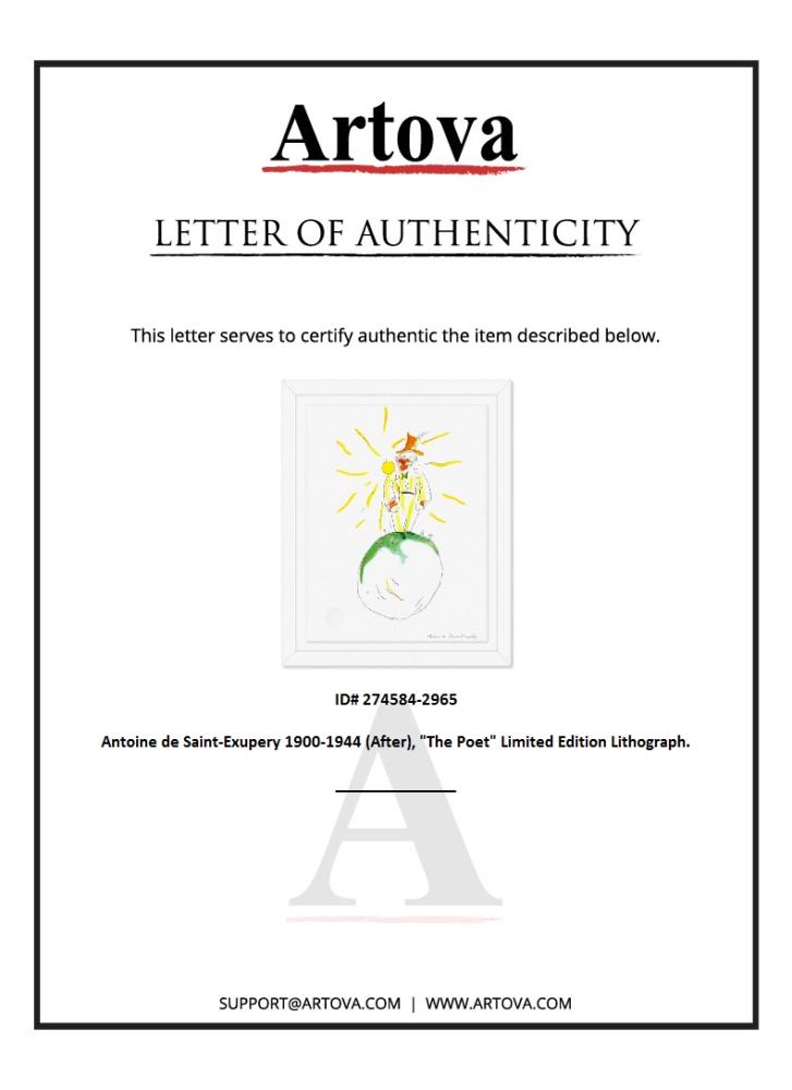 "The Poet" is a limited edition lithograph on paper by Antoine de Saint-Exupery 1900-1944 (After), bearing the plate signature of the artist.This piece comes from an edition of 300 authorized by the Exupery Estate, but the pieces in this edition are not individually numbered. This piece comes custom framed. Includes Certificate of Authenticity. Measures approx. 20" x 16" (frame) 16" x 12" (image). This item requires special handling and may have a longer than usual turnaround.