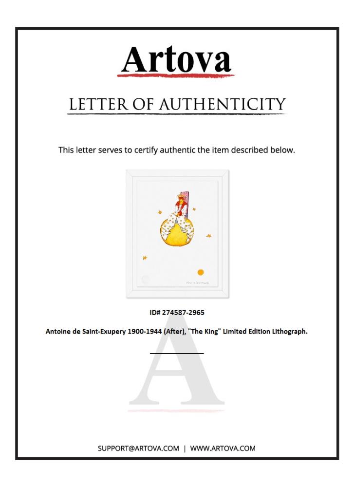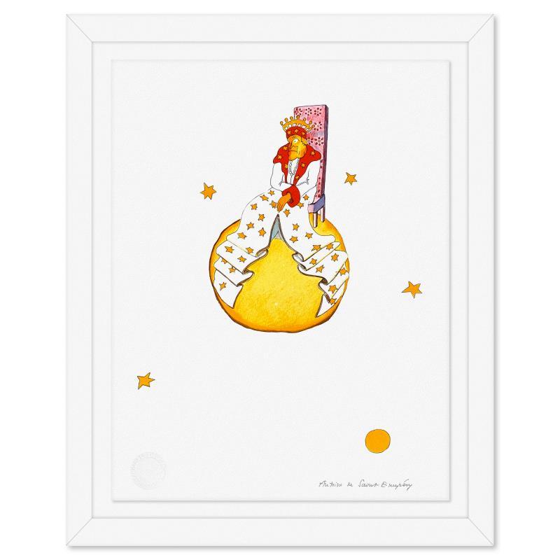 "The King" is a limited edition lithograph on paper by Antoine de Saint-Exupery 1900-1944 (After), bearing the plate signature of the artist.This piece comes from an edition of 300 authorized by the Exupery Estate, but the pieces in this edition are not individually numbered. This piece comes custom framed. Includes Certificate of Authenticity. Measures approx. 20" x 16" (frame) 16" x 12" (image). This item requires special handling and may have a longer than usual turnaround.