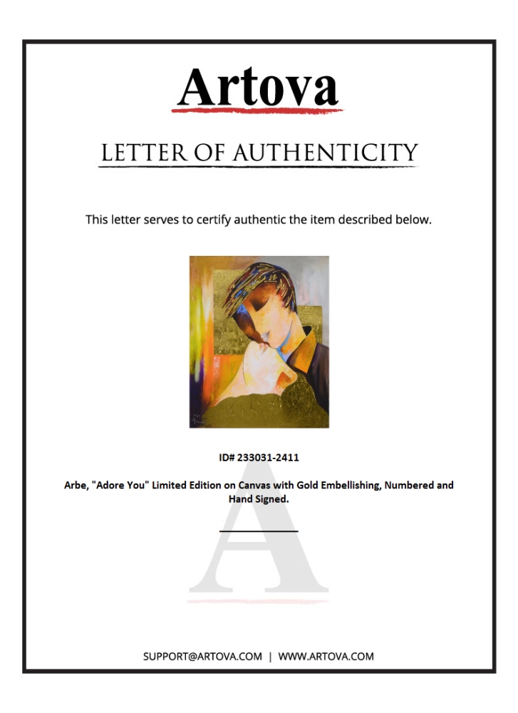 "Adore You" is a limited edition giclee on canvas with gold embellishing by Arbe, numbered and hand signed by the artist. Includes Certificate of Authenticity. Measures approx. 24" x 30" (image).