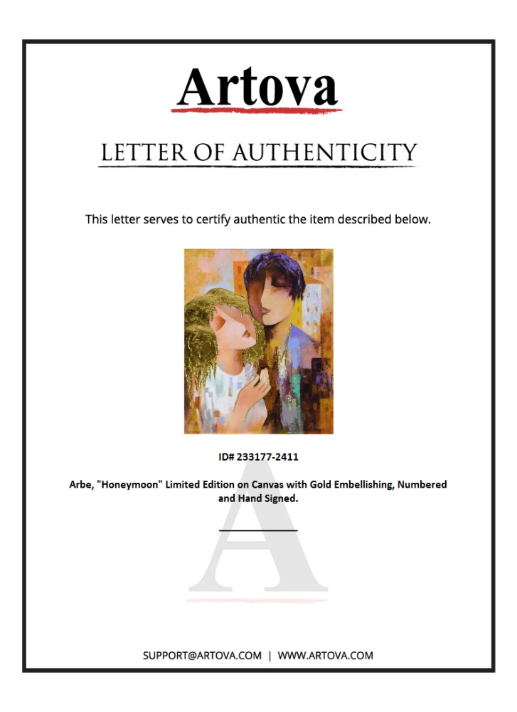 "Honeymoon" is a limited edition giclee on canvas with gold embellishing by Arbe, numbered and hand signed by the artist. Includes Certificate of Authenticity. Measures approx. 24" x 30" (image).