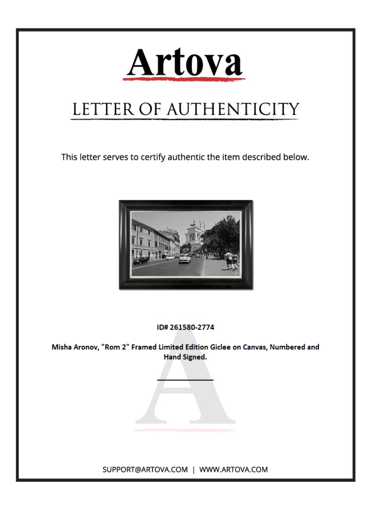 "Rom 2" is a limited edition giclee on canvas by photographer Misha Aronov, numbered and hand-signed by the artist. The piece comes custom framed and includes Letter of Authenticity. Measures approximately 26.5" x 39.5" (framed); 18.5" x 31.5" (image).