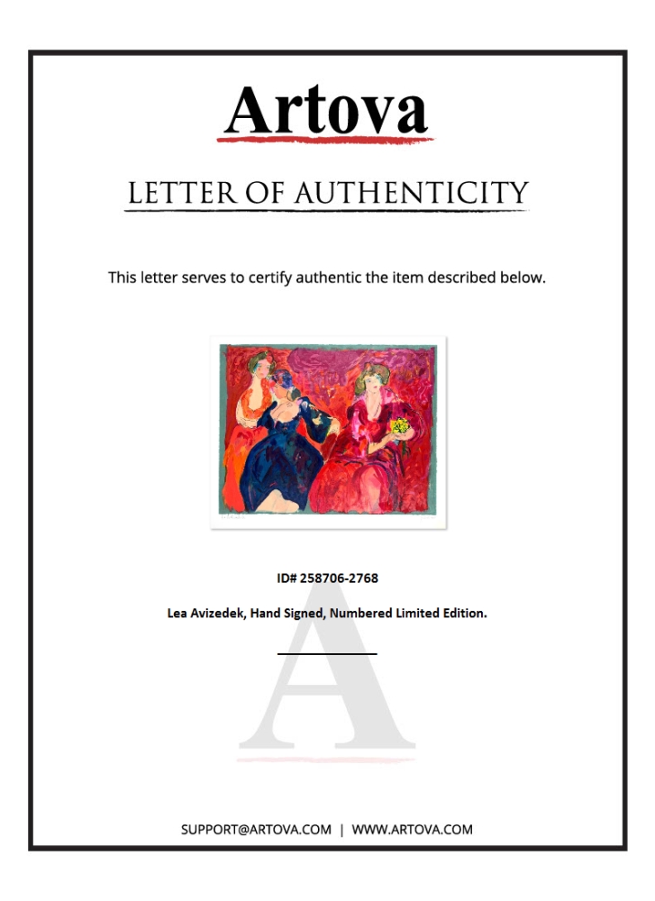 This is a limited edition print on paper by Lea Avizedek. The piece comes hand-signed by the artist, numbered, and with a letter of authenticity. Measures approximately 20" x 26".