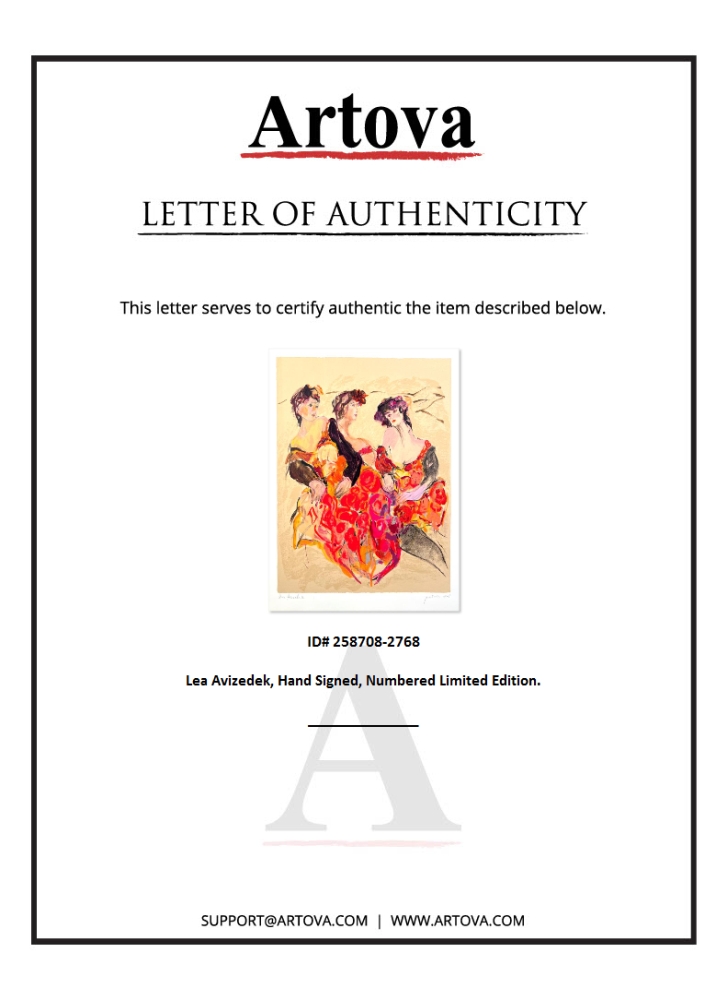 This is a limited edition print on paper by Lea Avizedek. The piece comes hand-signed by the artist, numbered, and with a letter of authenticity. Measures approximately 25" x 18".