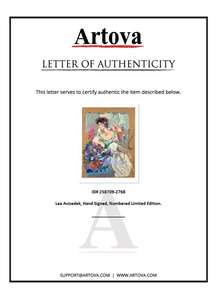 This is a limited edition print on paper by Lea Avizedek. The piece comes hand-signed by the artist, numbered, and with a letter of authenticity. Measures approximately 27" x 20".