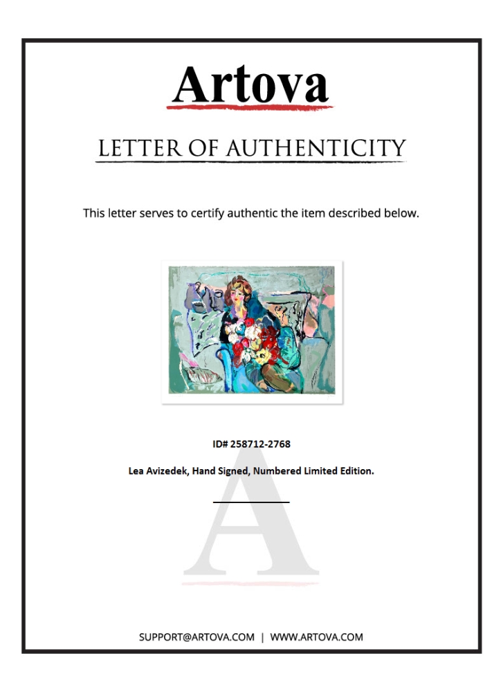This is a limited edition print on paper by Lea Avizedek. The piece comes hand-signed by the artist, numbered, and with a letter of authenticity. Measures approximately 20" x 26.5".