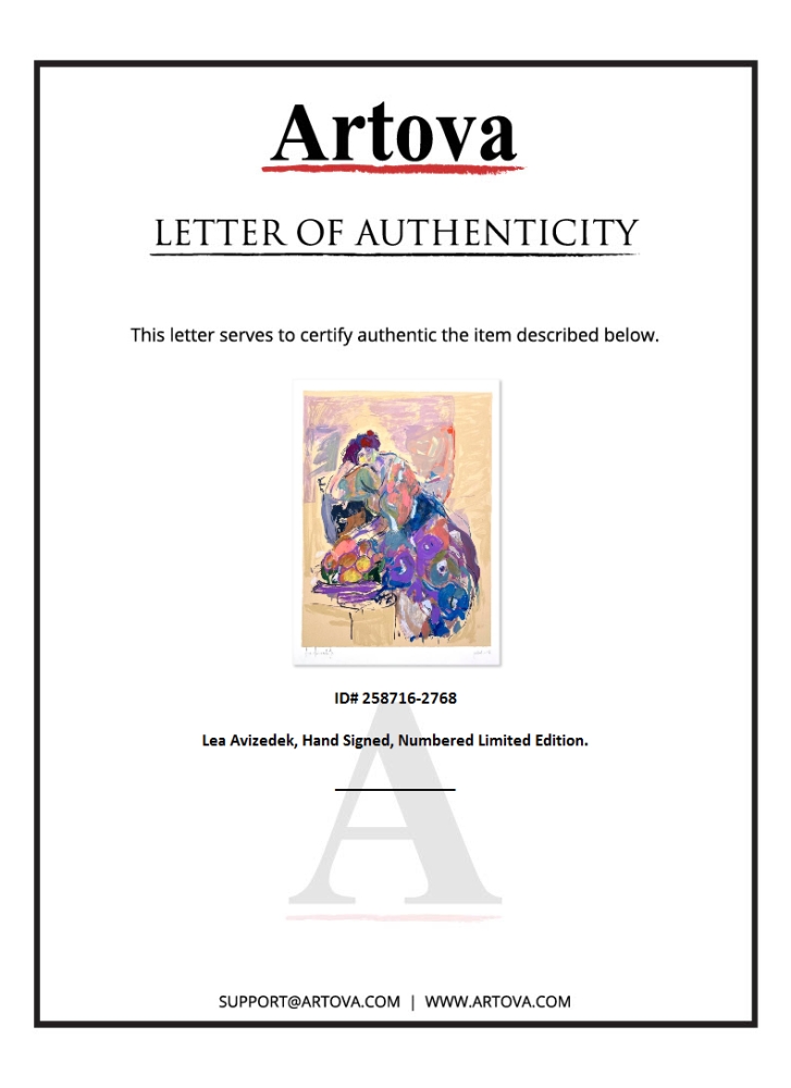 This is a limited edition print on paper by Lea Avizedek. The piece comes hand-signed by the artist, numbered, and with a letter of authenticity. Measures approximately 24.5" x 18".