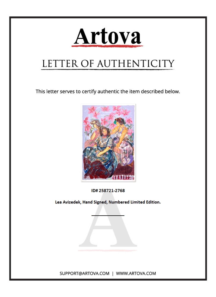This is a limited edition print on paper by Lea Avizedek. The piece comes hand-signed by the artist, numbered, and with a letter of authenticity. Measures approximately 43" x 30".