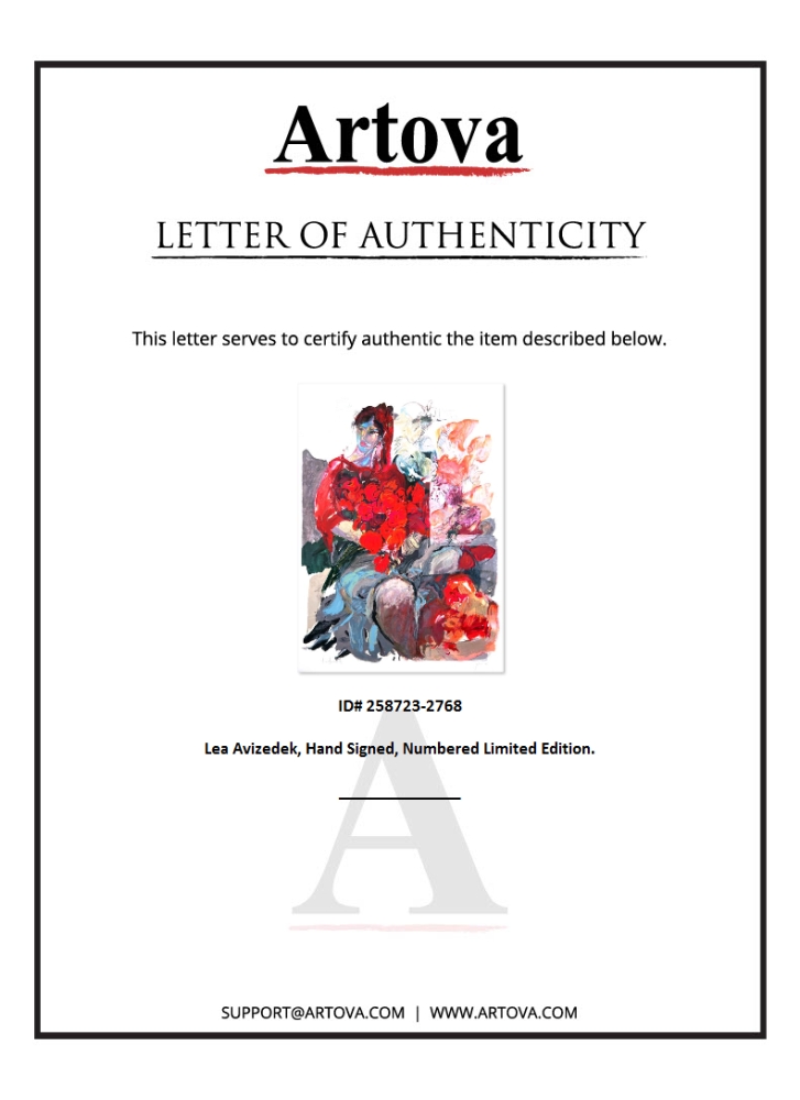 This is a limited edition print on paper by Lea Avizedek. The piece comes hand-signed by the artist, numbered, and with a letter of authenticity. Measures approximately 37.5" x 27".