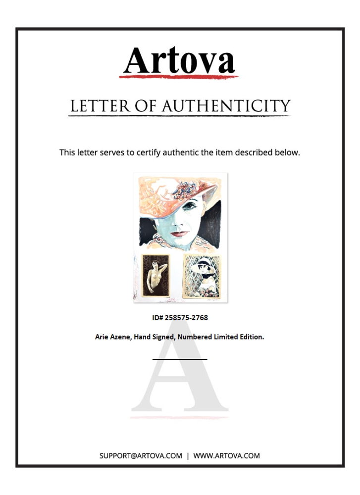 This is a limited edition serigraph on paper by Arie Azene. The piece comes hand-signed by the artist, numbered, and with a letter of authenticity. Measures approximately 27.5" x 18".