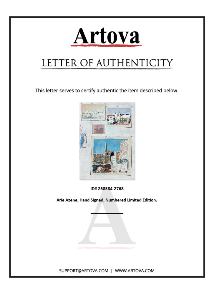 This is a limited edition serigraph on paper by Arie Azene. The piece comes hand-signed by the artist, numbered, and with a letter of authenticity. Measures approximately 28" x 19.5".