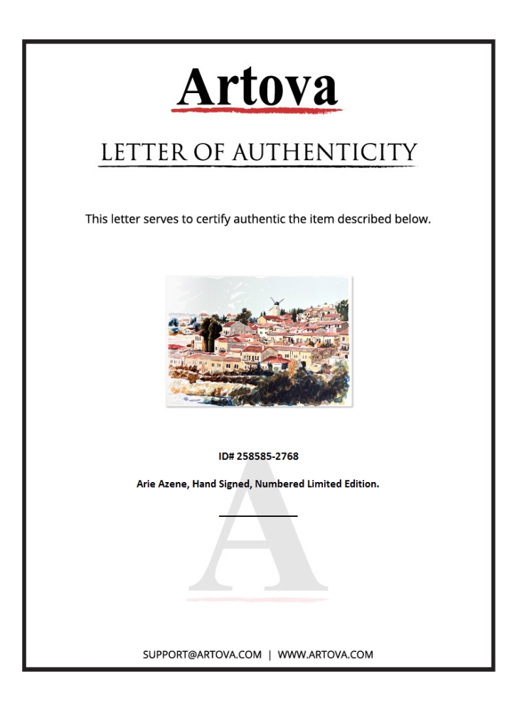 This is a limited edition serigraph on paper by Arie Azene. The piece comes hand-signed by the artist, numbered, and with a letter of authenticity. Measures approximately 27.5" x 19".
