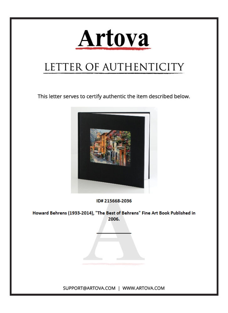 "The Best of Behrens" is a remarkable book about a remarkable artist. For many years, Howard Behrens' evocative paintings of exotic, sun-drenched landscapes have been widely praised and collected, many as limited edition prints. The Illustrated index for this volume show the images and details for all prints issued from 1980 to 2006. "The Best of Behrens" is a deluxe coffee-table book published in 2006 that features the best of Behrens' limited editions for the past 25 years (95 pages). A limited number of these books were created. Measures approximately 11.5" x 10.5" (case), 11.5" x 10.5" (book).