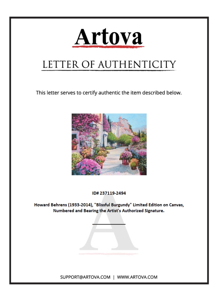 "Blissful Burgundy" is a limited edition giclee on canvas by Howard Behrens (1933-2014), numbered and bearing the authorized signature of the artist. This piece is from Behrens' Legacy Edition. Includes Certificate of Authenticity. Measures approx. 22" x 18" (image).