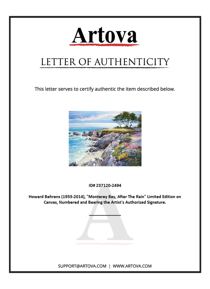 "Monterey Bay, After The Rain" is a limited edition giclee on canvas by Howard Behrens (1933-2014), numbered and bearing the authorized signature of the artist. This piece is from Behrens' Legacy Edition. Includes Certificate of Authenticity. Measures approx. 32" x 24" (image).