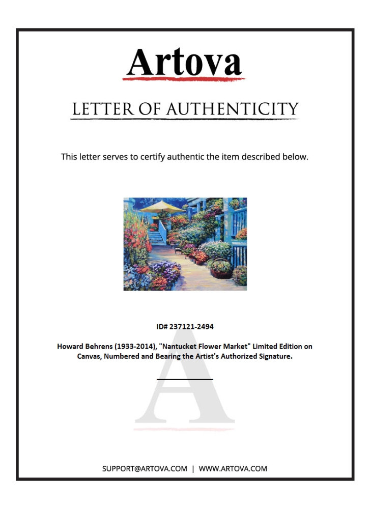 "Nantucket Flower Market" is a limited edition giclee on canvas by Howard Behrens (1933-2014), numbered and bearing the authorized signature of the artist. This piece is from Behrens' Legacy Edition. Includes Certificate of Authenticity. Measures approx. 32" x 24" (image).
