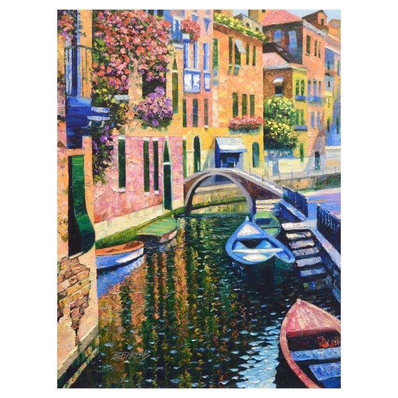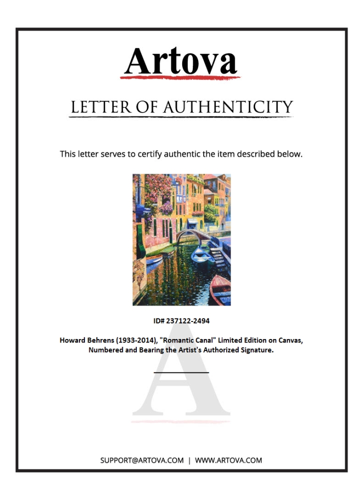 "Romantic Canal" is a limited edition giclee on canvas by Howard Behrens (1933-2014), numbered and bearing the authorized signature of the artist. This piece is from Behrens' Legacy Edition. Includes Certificate of Authenticity. Measures approx. 24" x 32" (image).