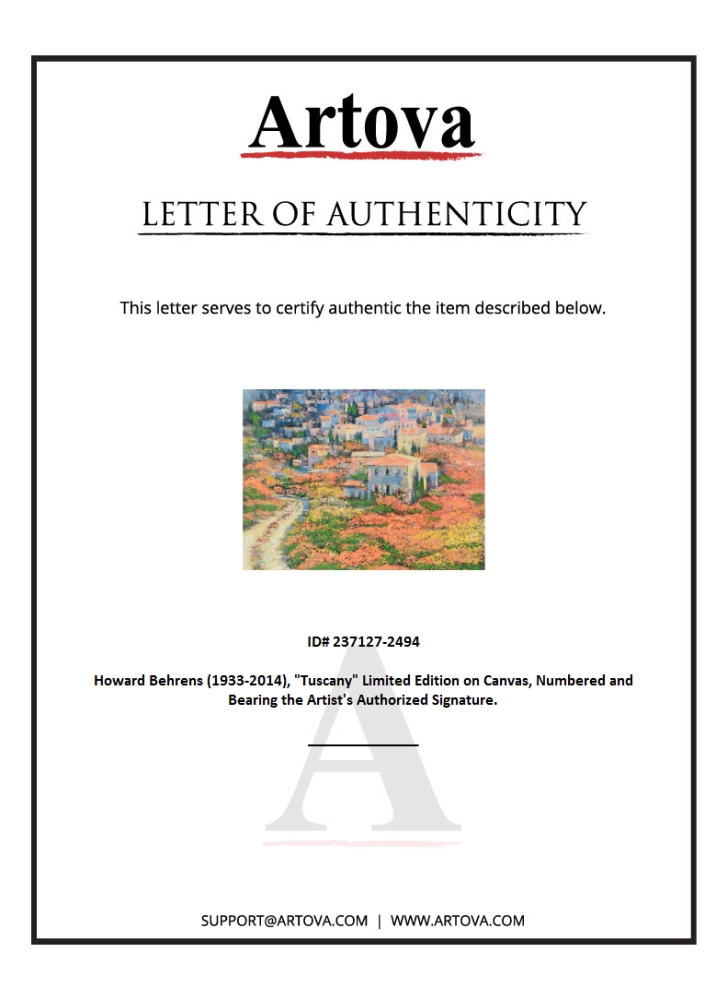 "Tuscany" is a limited edition giclee on canvas by Howard Behrens (1933-2014), numbered and bearing the authorized signature of the artist. This piece is from Behrens' Legacy Edition. Includes Certificate of Authenticity. Measures approx. 32" x 24" (image).