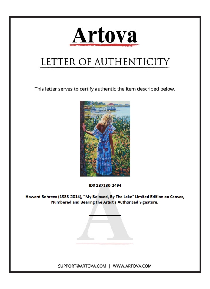 "My Beloved, By The Lake" is a limited edition giclee on canvas by Howard Behrens (1933-2014), numbered and bearing the authorized signature of the artist. This piece is from Behrens' Legacy Edition. Includes Certificate of Authenticity. Measures approx. 24" x 36" (image).