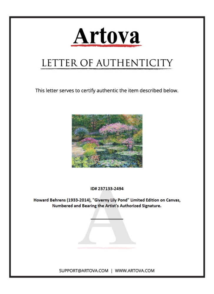 "Giverny Lily Pond" is a limited edition giclee on canvas by Howard Behrens (1933-2014), numbered and bearing the authorized signature of the artist. This piece is from Behrens' Legacy Edition. Includes Certificate of Authenticity. Measures approx. 32" x 24" (image).
