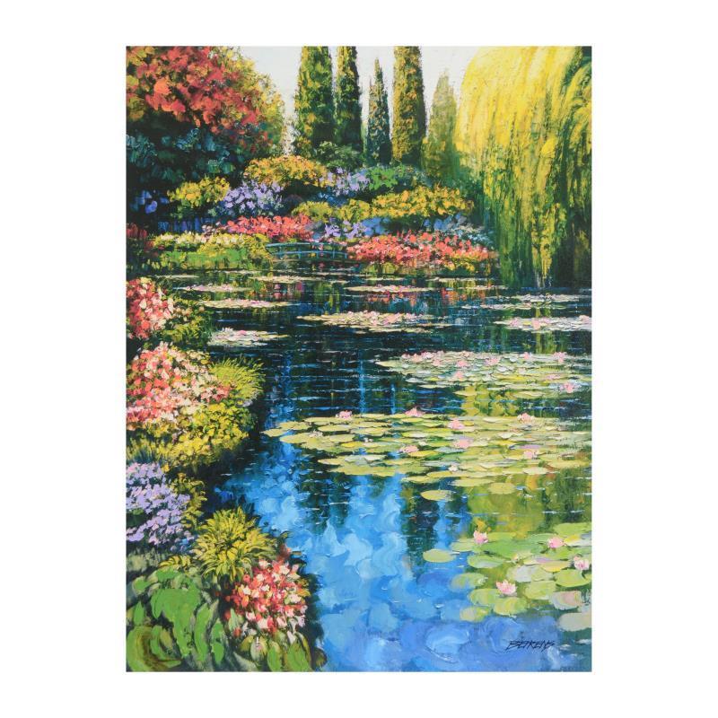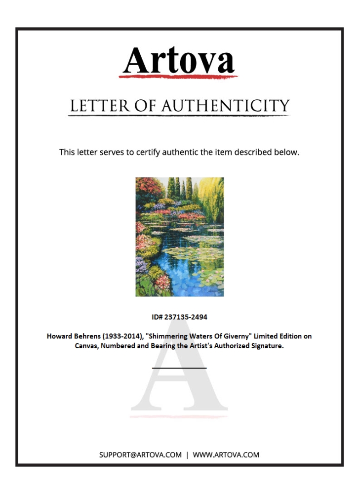 "Shimmering Waters Of Giverny" is a limited edition giclee on canvas by Howard Behrens (1933-2014), numbered and bearing the authorized signature of the artist. This piece is from Behrens' Legacy Edition. Includes Certificate of Authenticity. Measures approx. 24" x 32" (image).
