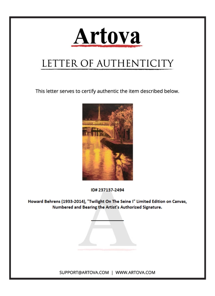 "Twilight On The Seine I" is a limited edition giclee on canvas by Howard Behrens (1933-2014), numbered and bearing the authorized signature of the artist. This piece is from Behrens' Legacy Edition. Includes Certificate of Authenticity. Measures approx. 18" x 27" (image).